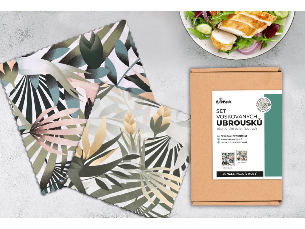 Sada JUNGLE PACK obsahuje 2 ekologické voskované ubrousky pro skladování potravin místo fólie a plastu: