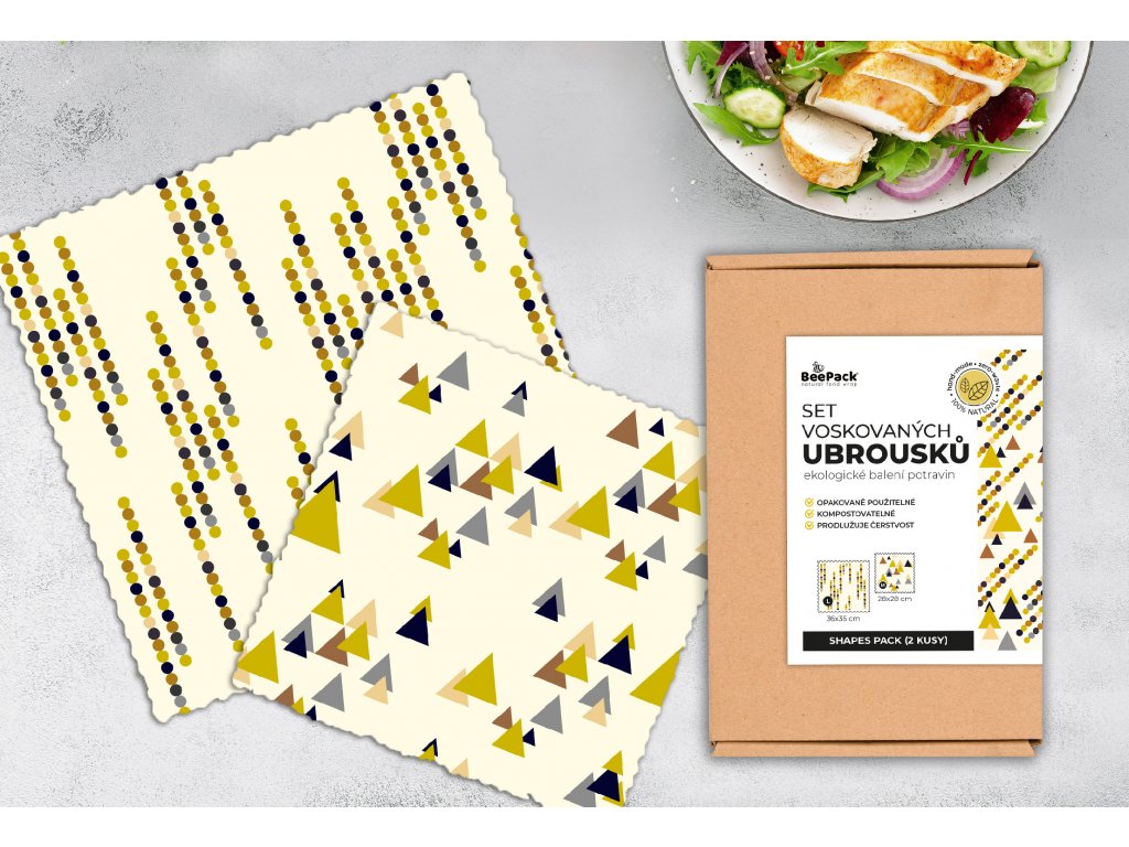 Sada SHAPES PACK obsahuje 2 velké ekologické voskované ubrousky pro skladování potravin místo fólie a plastu: