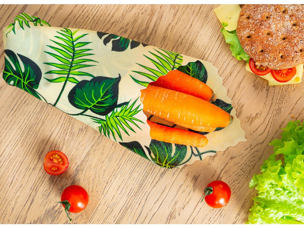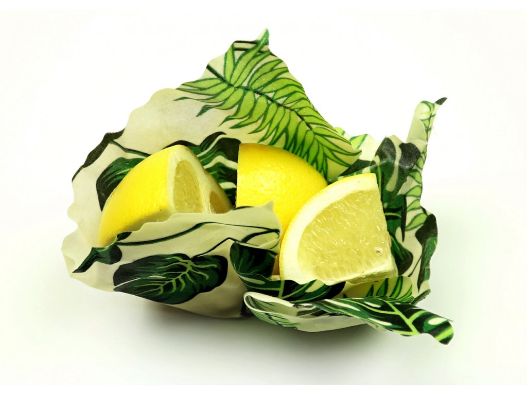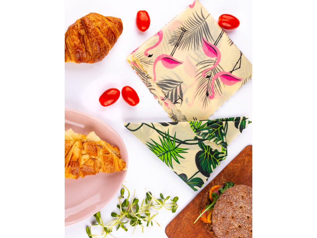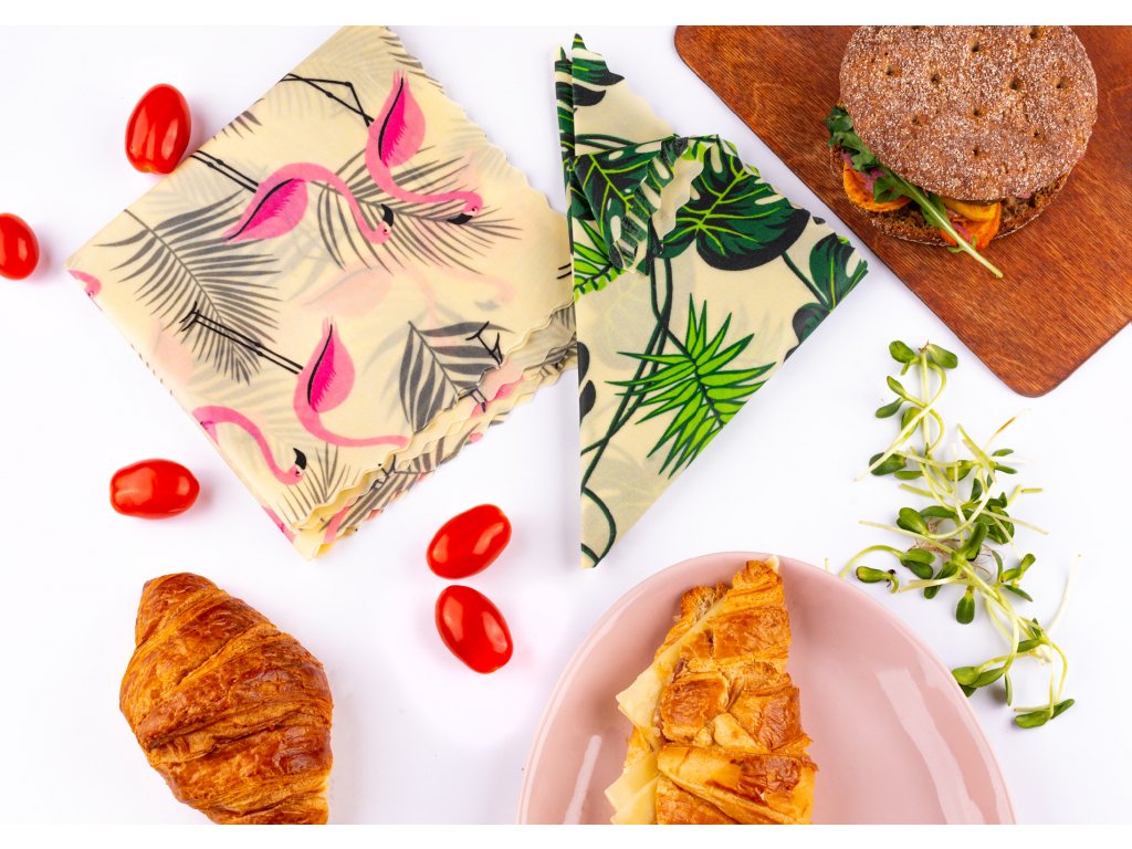 Sada TROPICAL PACK obsahuje 3 ekologické voskované ubrousky na uskladnění potravin místo fólie a plastu: